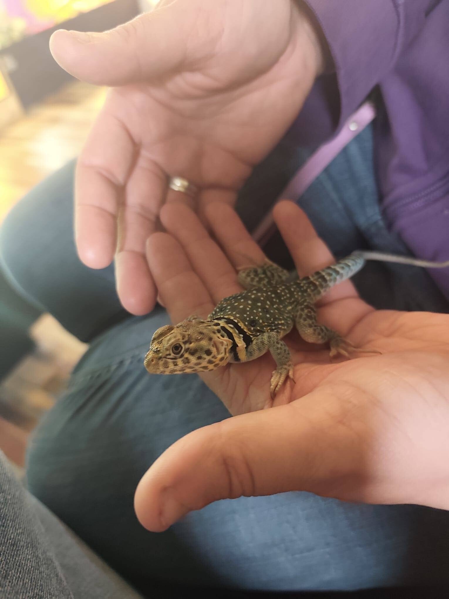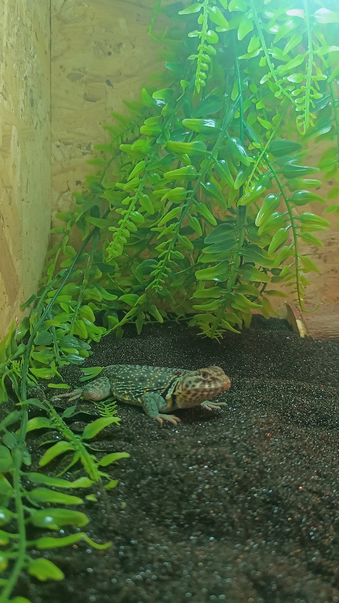 Pablo, de halsbandleguaan. Een waar schatje, geboren op 29 september 2025. Nu nog klein en razendsnel, maar dankzij de toewijding en zorg van zijn vorige eigenaren is Pablo al super tam. Hij voelt zich al helemaal thuis in zijn warme verblijf, want Pablo houdt van heet!