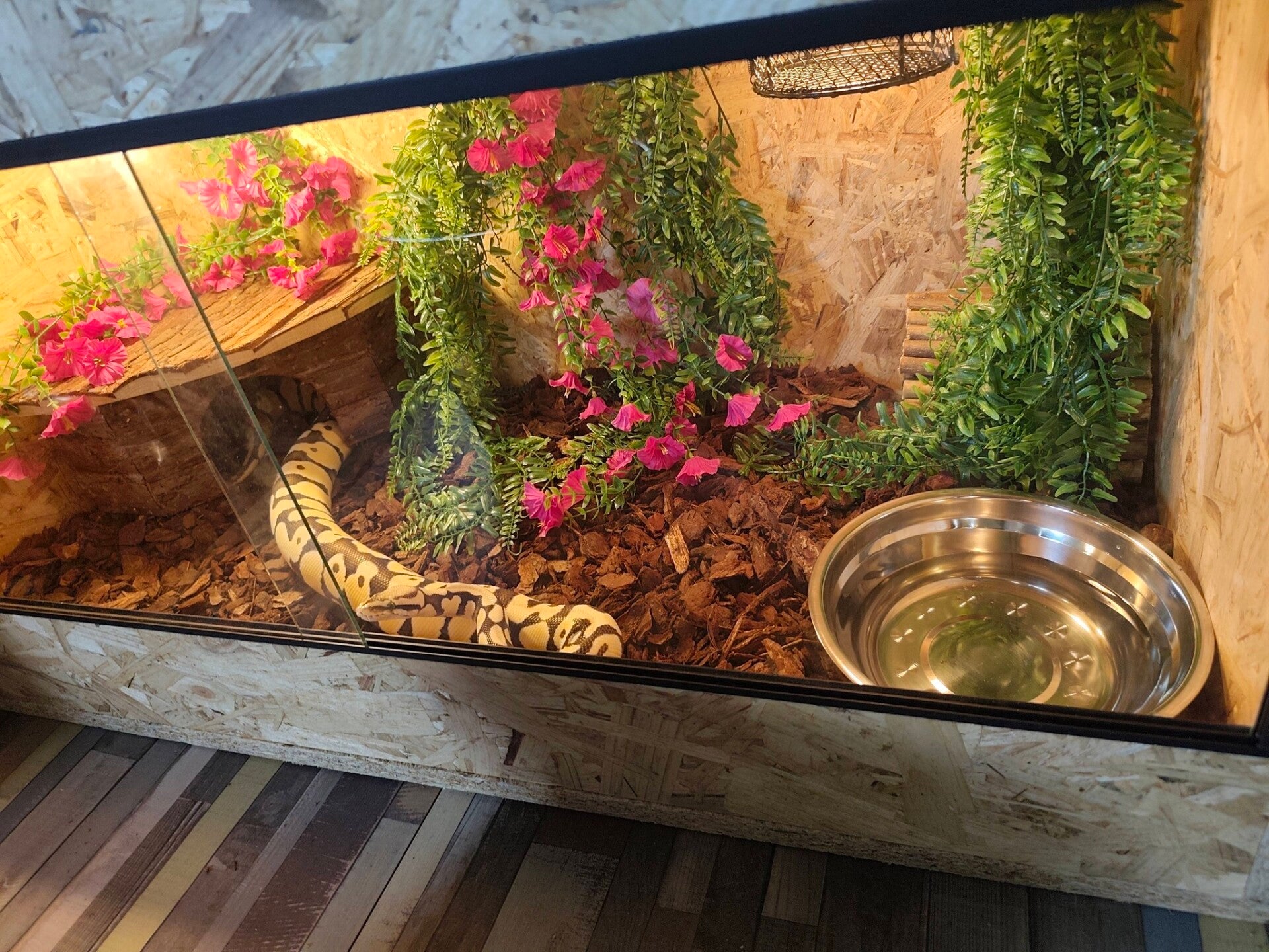 Als u Casper komt bezoeken, zult u een grote, rustige mannelijke python aantreffen die met zijn imposante aanwezigheid en zijn gedetailleerde tekeningen een kalme sfeer uitstraalt. Hij is een ware blikvanger binnen Herpetia.