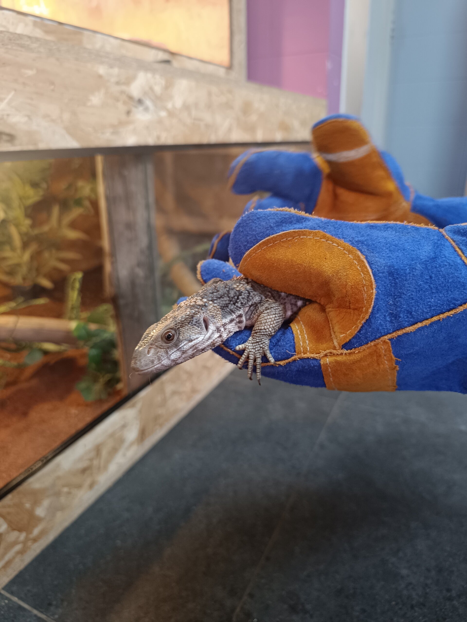 Onze steppevaraan, Tandloos, kwam in het voorjaar van 2025 als jonge varaan bij ons wonen. Geboren op 1 oktober 2024, heeft ze sindsdien al flink laten zien wie ze is. Laat je niet misleiden door haar naam; Tandloos heeft zeker wél tanden, en ze weet die ook te gebruiken! Oppakken zonder handschoenen is dan ook geen goed idee. Als ze eenmaal een handschoen te pakken krijgt, draait ze ermee rond als een echte krokodil — krachtig en indrukwekkend om te zien. Toch heeft Tandloos ook een andere, minder bekende kant. Zodra ze zich veilig voelt en rustig vastzit, ontspant ze en vindt ze het stiekem best fijn om geaaid te worden. Maar sssst… dat houden we geheim, want dat past natuurlijk niet bij haar stoere imago! Tandloos kan nog een flink stuk groeien en ligt het liefst heerlijk te chillen onder haar warmtelamp, waar ze alles rustig in de gaten houdt.
